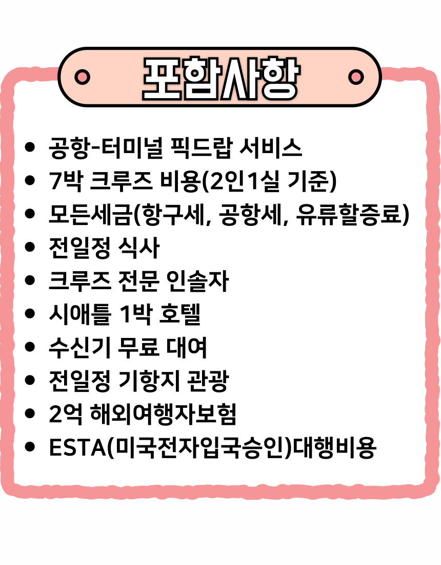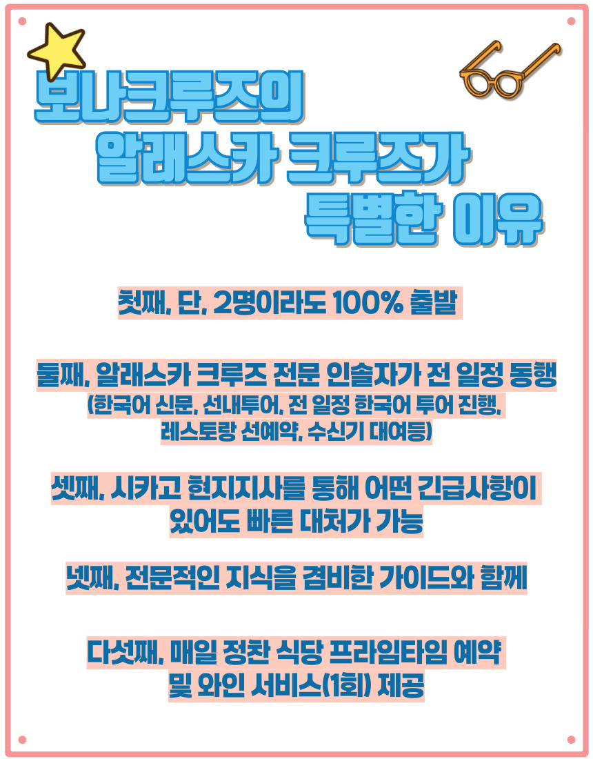 ✴️명실상부 스테디설러 알래스카 크루즈~! ✅시카고 현지 지사를 통한 편리하고 다양한 크루즈여행 일정이 가능 ✅원하는 날짜에 출발확정 걱정 없이 단 두명이라도 출발 가능(현지 조인, 전문가이드 동행) ✅크루즈여행을 즐긴다면 한번은 가봐야하는 코스 💢항공권만 준비하세요! 합리적인 가격으로 즐기는 알래스카 크루즈~!
